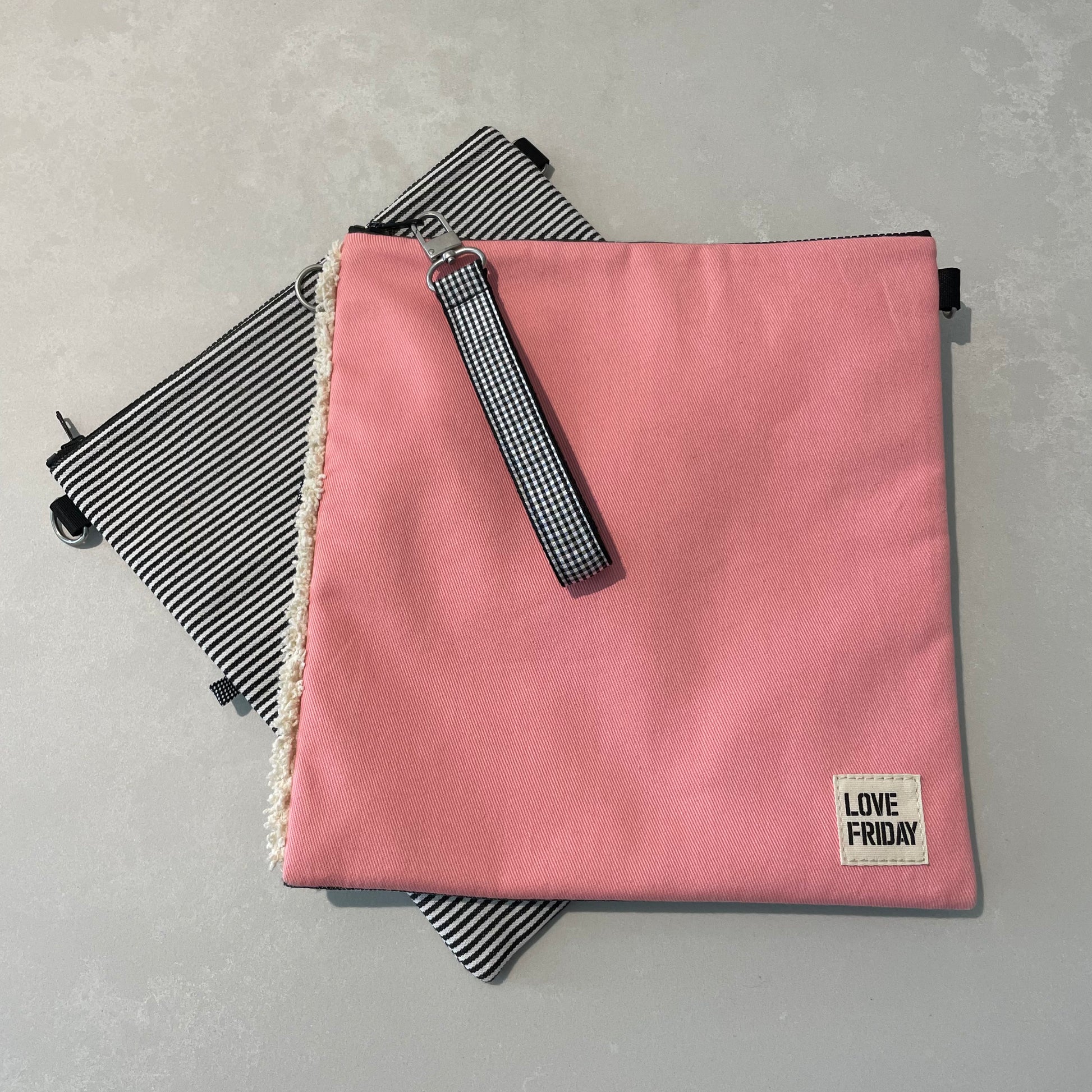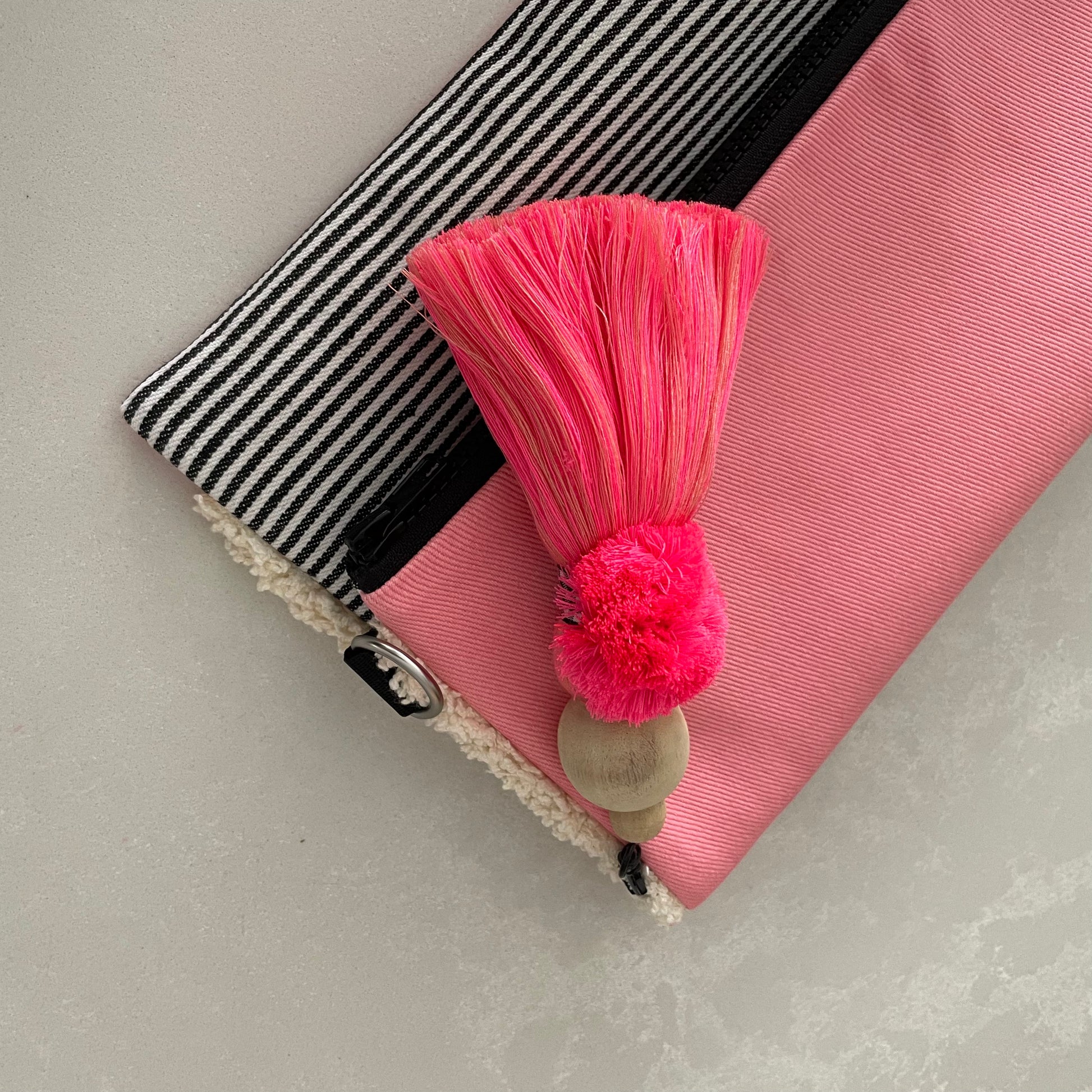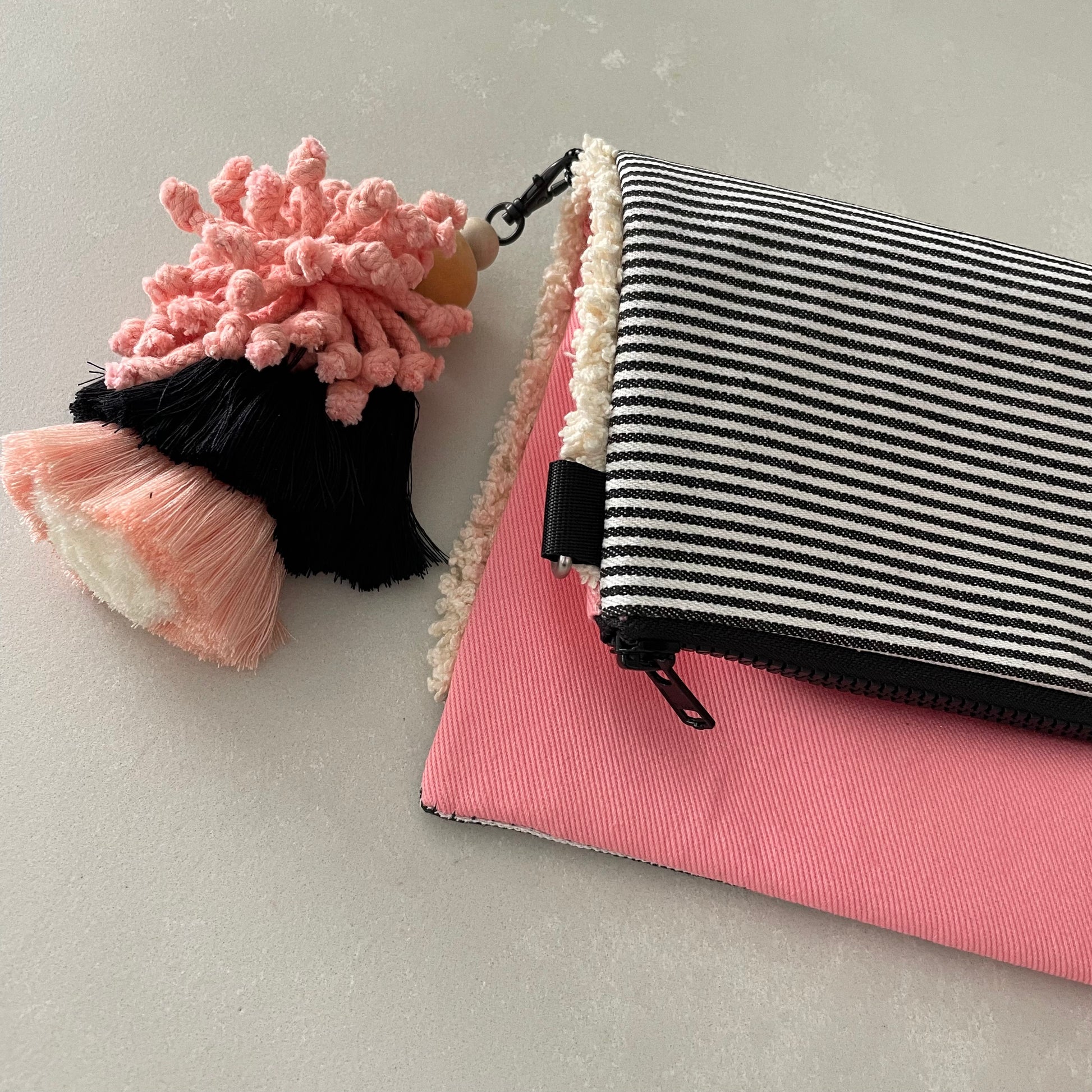 FABRIC: two sided, pink /charcoal and white stripe with cream ruffle down one side